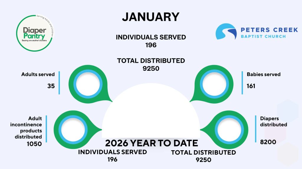 The Diaper Pantry at Peters Creek Baptist Church was birthed in 2021 in response to a need in the community for the basic necessities of families in the area. Today, The Diaper Pantry serves well over 100 families each month, not only by meeting material needs, but spiritual needs through prayer.
